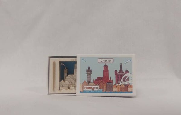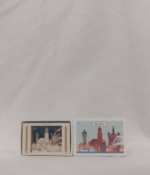 In de winkel en online, leuk om cadeau tegeven of om zelf in je huis te zetten. Een luciferdoosje met de daarin de de mooiste skyline van Nederland, Deventer.