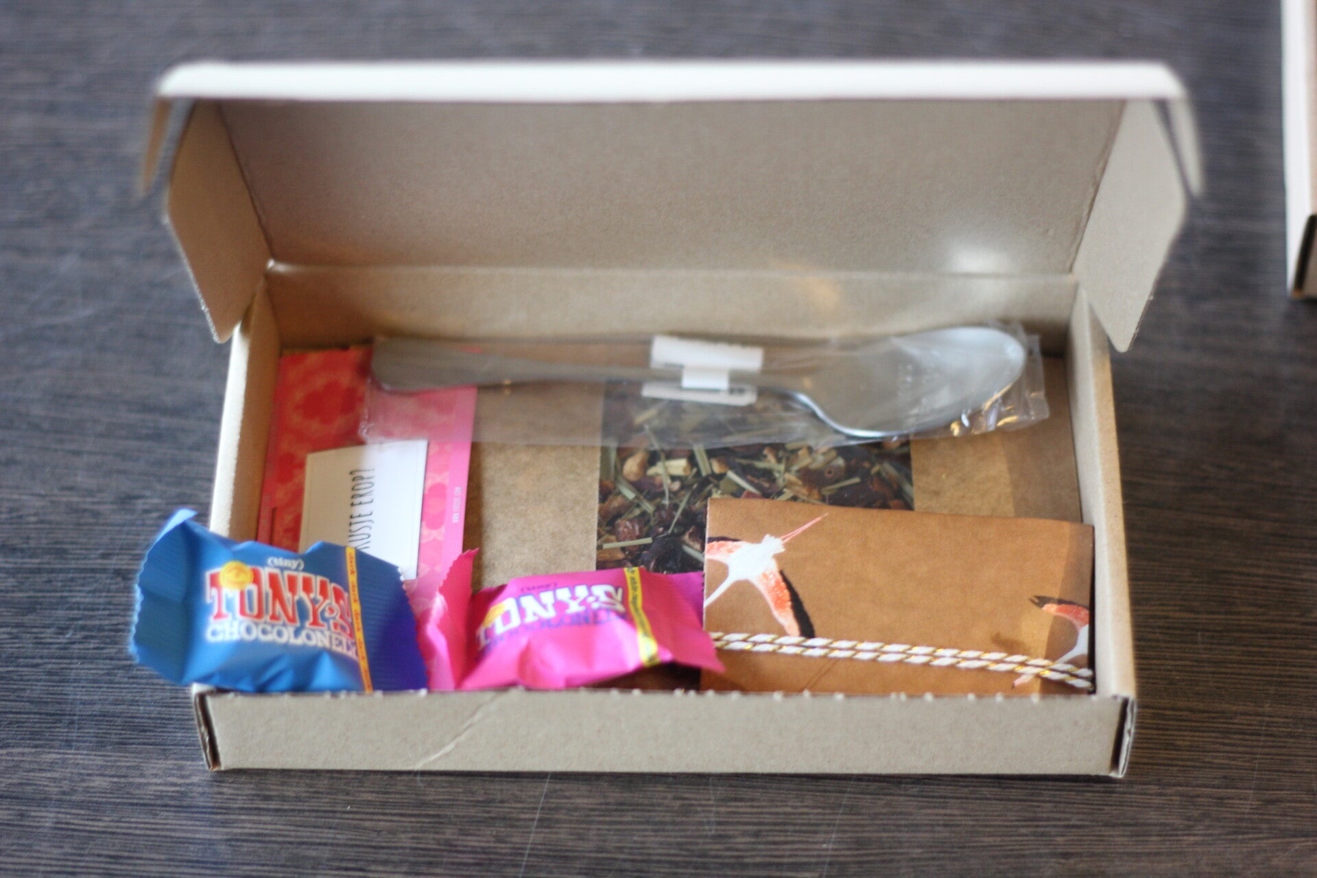 Een lekker kopje thee met een chocolaatje. Wij stopten het in een beterschapsdoosje.