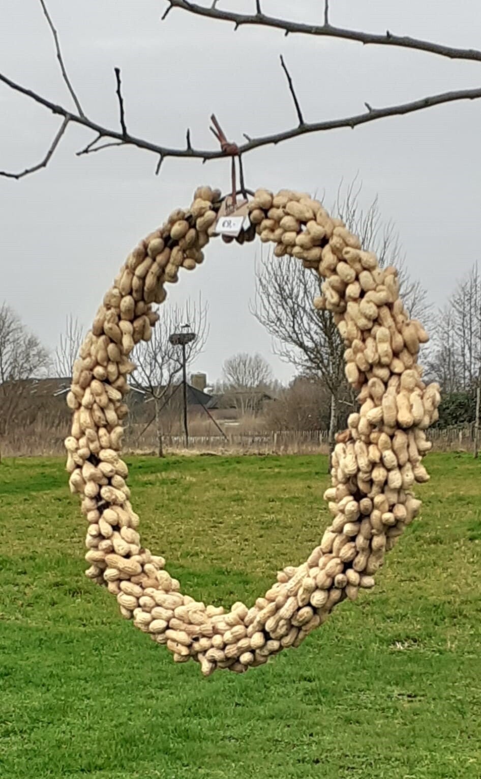 Deze pindakrans is gemaakt van pinda's, uiteraard, en van onze eigen wilgentenen uit de Duursche Waarden, de parel van de IJssel...