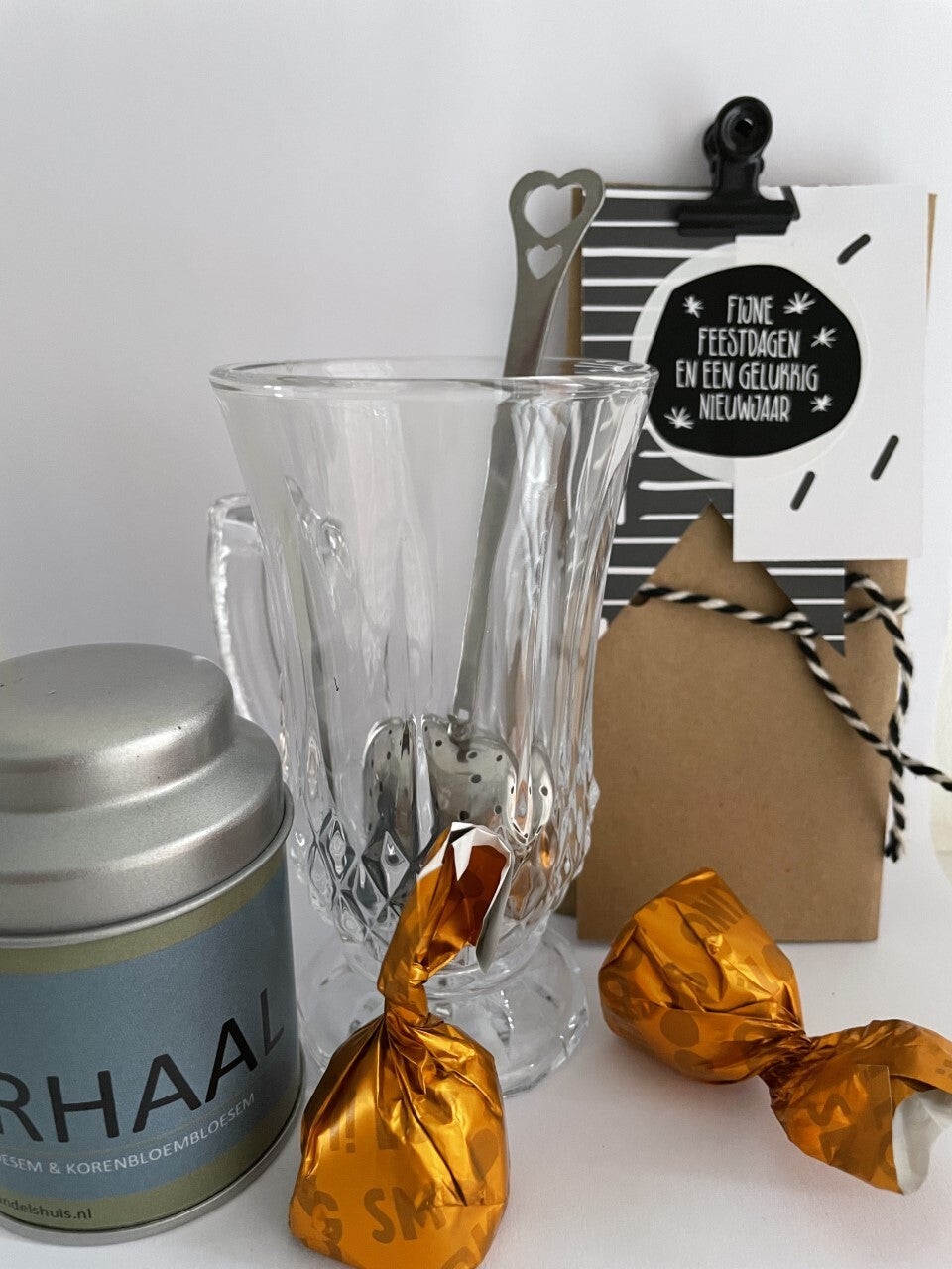 Voor de kerst hebben onze medewerkers een mooi kerstpakketje samengesteld, Voorzien met ONS eigen thee in samnewerking met Evelief, Daarbij een glas en een theeknijper.